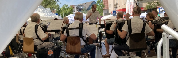 Über schlechtes Wetter konnte man sich beim Stadtfest gewiss nicht beklagen – es war einfach nur heiß. Auch am Sonntagmittag, als wir – Orchester und Ensemble gemeinsam – auf der Bühne saßen und gut eine Stunde lang für Unterhaltung sorgten.